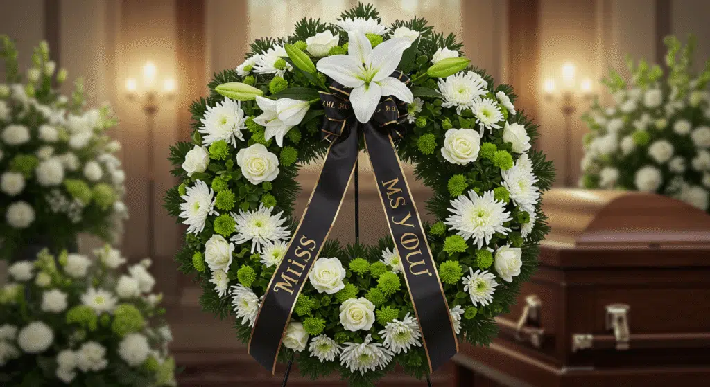 Coroas de flores preparadas com delicadeza e respeito, simbolizando amor, gratidão e saudade na última despedida.